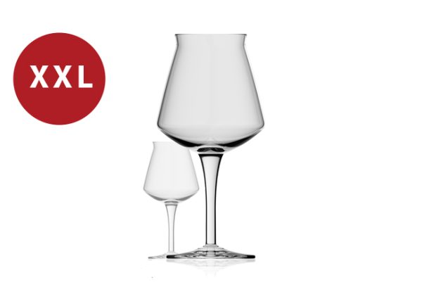 ”Teku XXL, ölglasets ölglas fast i en ”oversize”-version. Glaset mäter 38,7 cm i höjd och 18,8 i diameter. En ståtlig pjäs som inte liknar något annat.”
